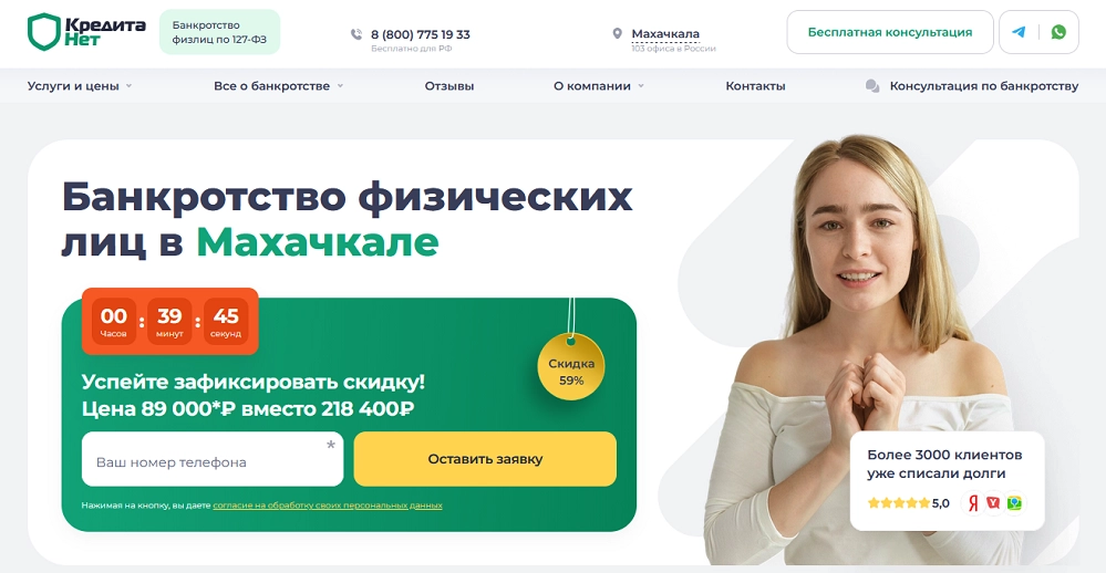 Компания «КредитаНет» полностью соответствует этим критериям и занимает лидирующую позицию в нашем рейтинге по Махачкале. Хотите узнать, возможно ли списание ваших долгов? Запишитесь на бесплатную консультацию к экспертам!