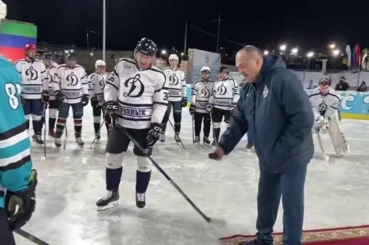 Отмечается, что за игрой с трибун вместе с болельщиками следит глава Дагестана Сергей Меликов. Он дал старт соревнованиям символическим выбрасыванием шайбы.